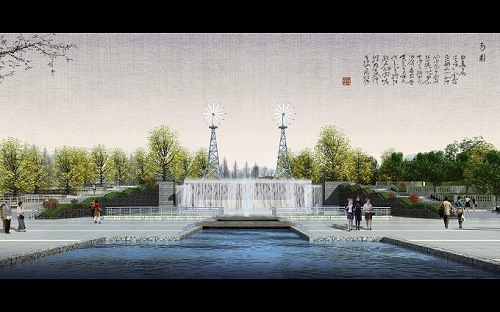 印象宿州風(fēng)車瀑布廣場節(jié)點位于新汴河風(fēng)景區(qū)206國道東側(cè),總設(shè)計面積約20700㎡。設(shè)計理念意圖用動態(tài)水景的多層之勢體現(xiàn)城市發(fā)展之活力,表現(xiàn)出宿州城市動感,向上的城市風(fēng)貌。另外,在古詩中廣為流傳的宿州八景也通過繪畫和雕刻的形式在廣場上展現(xiàn),生動地體現(xiàn)宿州市變化的滄海桑田,讓游人憶古惜今,領(lǐng)略宿州城市的巨大變化。